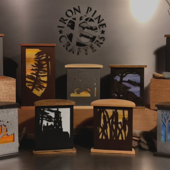 Measuring 7.5" wide x 9" tall by 6" deep, your custom-crafted lamp is made from 20-gauge steel, stained glass and your choice of wood base. Five choices for your finish; Stove Pipe, Cast Iron, Distressed Bronze, and Hammered Copper. Choose your finish for base and top; Espresso Stained Oak, Distressed Espresso Stained Oak, Ebony Stained Oak, Distressed Ebony Stained Oak, and Mahogany. Complete your custom look with one of six stained glass colors. Woodwork is finished out with satin acrylic. The distressed bronze finish is hand-applied patina and will vary from lamp to lamp. Since these are custom made to order, please allow four to six weeks for your lamp to be crafted and shipped.