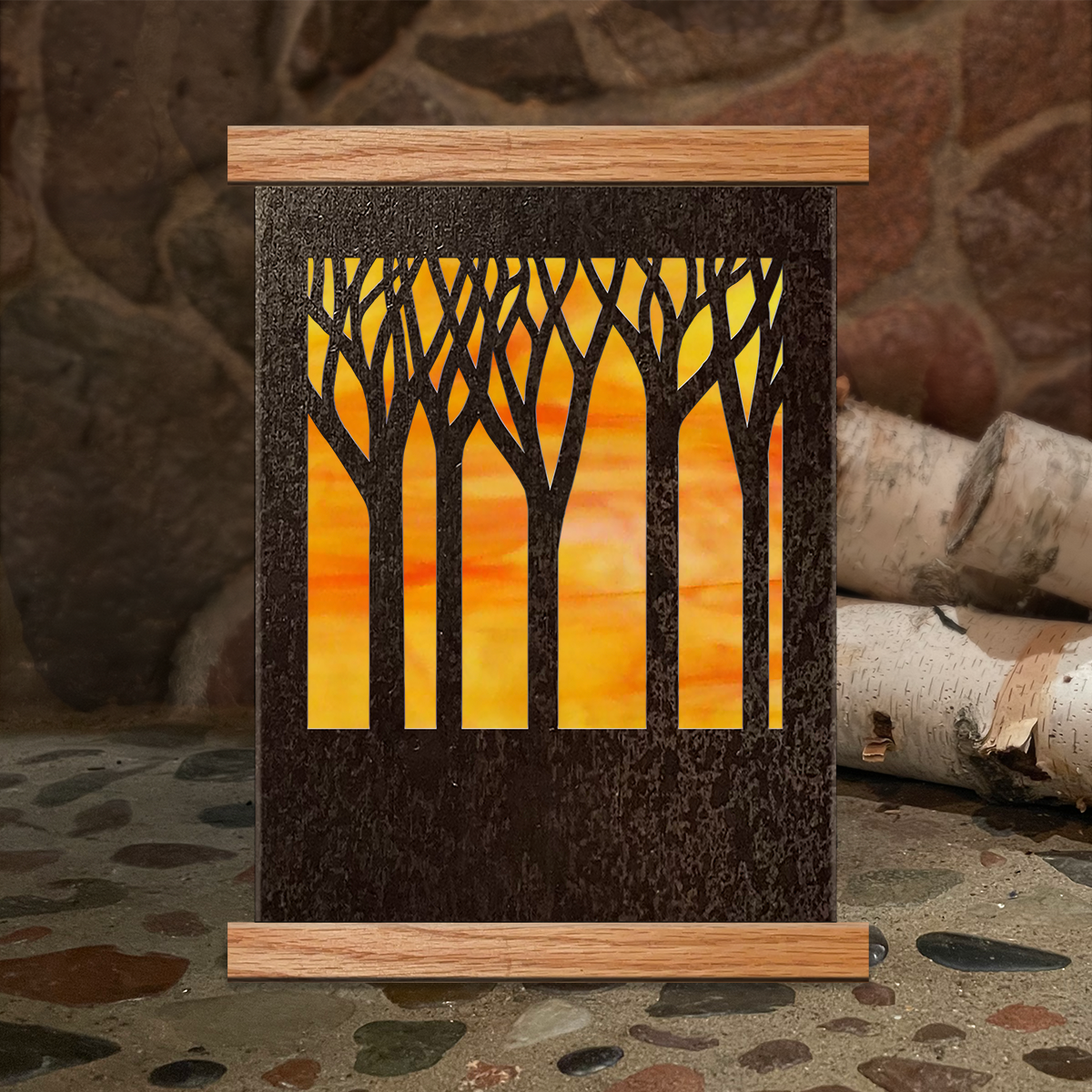 Measuring 7.5" wide x 9" tall by 6" deep, your custom-crafted lamp is made from 20-gauge steel, stained glass and your choice of wood base. Five choices for your finish; Stove Pipe, Cast Iron, Distressed Bronze, and Hammered Copper. Choose your finish for base and top; Espresso Stained Oak, Distressed Espresso Stained Oak, Ebony Stained Oak, Distressed Ebony Stained Oak, and Mahogany. Complete your custom look with one of six stained glass colors. Woodwork is finished out with satin acrylic. The distressed bronze finish is hand-applied patina and will vary from lamp to lamp. Since these are custom made to order, please allow four to six weeks for your lamp to be crafted and shipped.