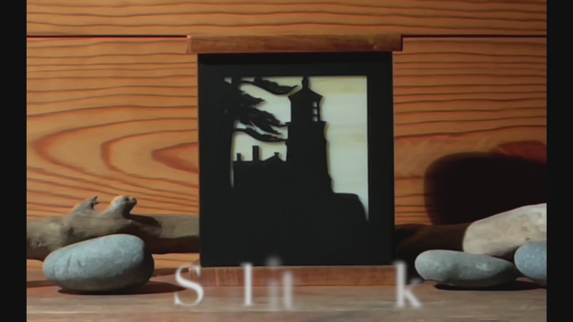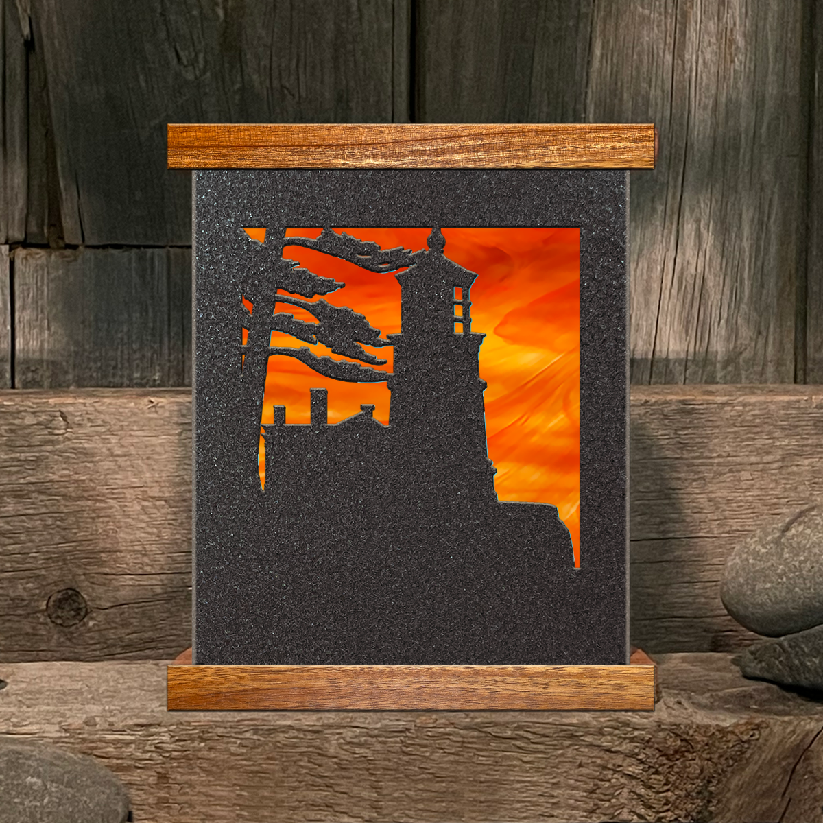 Small Iron Pine accent lamp featuring Split Rock Lighthouse. Lamp measures 5" wide x 6" high x 3.5" deep. It is crafted from 20-gauge steel. The base and top are made from acacia wood and have a matte finish. You choose any of six colors for your stained glass!