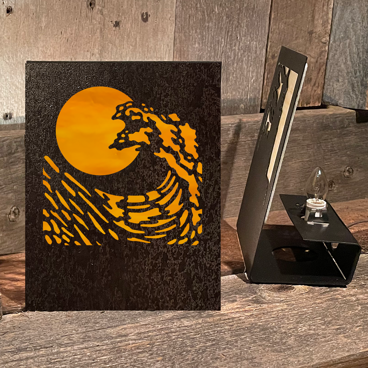 This Iron Pine easel-style accent lamp features the silhouette of a giant wave eclipsing the sun (or moon). Lamp measures 6.5" wide x 8.5" high x 4" deep. It is crafted from 18-gauge steel. Choose your finish and stained glass with the "customize" button.