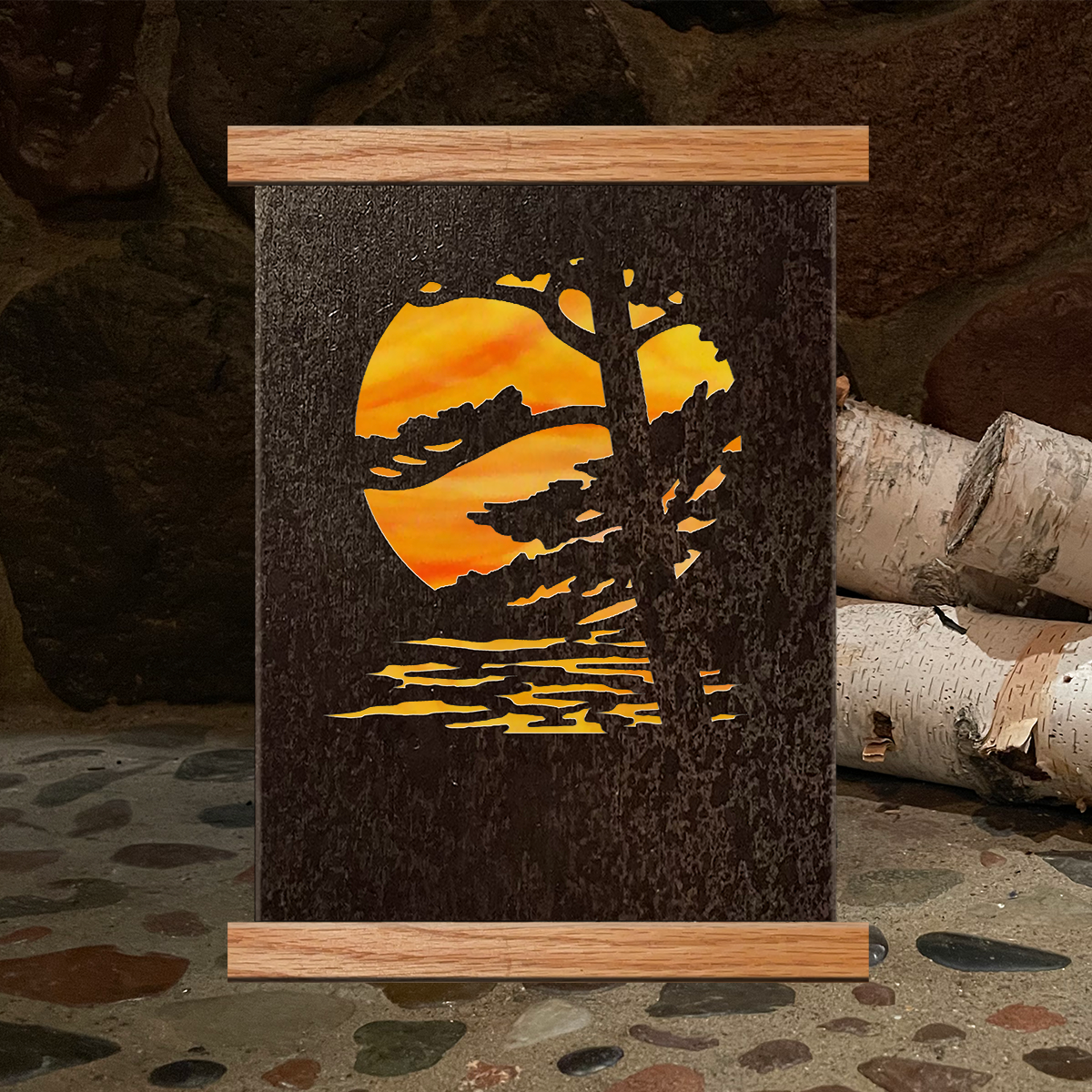 Measuring 7.5" wide x 9" tall by 6" deep, your custom-crafted lamp is made from 20-gauge steel, stained glass and your choice of wood base. Five choices for your finish; Stove Pipe, Cast Iron, Distressed Bronze, and Hammered Copper. Choose your finish for base and top; Espresso Stained Oak, Distressed Espresso Stained Oak, Ebony Stained Oak, Distressed Ebony Stained Oak, and Mahogany. Complete your custom look with one of six stained glass colors. Woodwork is finished out with satin acrylic. The distressed bronze finish is hand-applied patina and will vary from lamp to lamp. Since these are custom made to order, please allow four to six weeks for your lamp to be crafted and shipped.