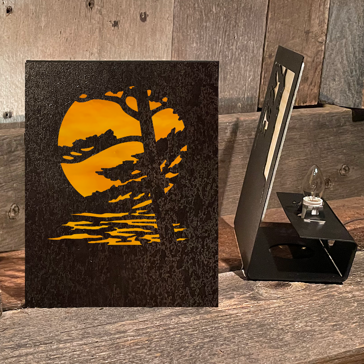 This Iron Pine easel-style accent lamp features the moon silhouetting a white pine. Lamp measures 6.5" wide x 8.5" high x 4" deep. It is crafted from 18-gauge steel. Choose your finish and stained glass with the "customize" button.