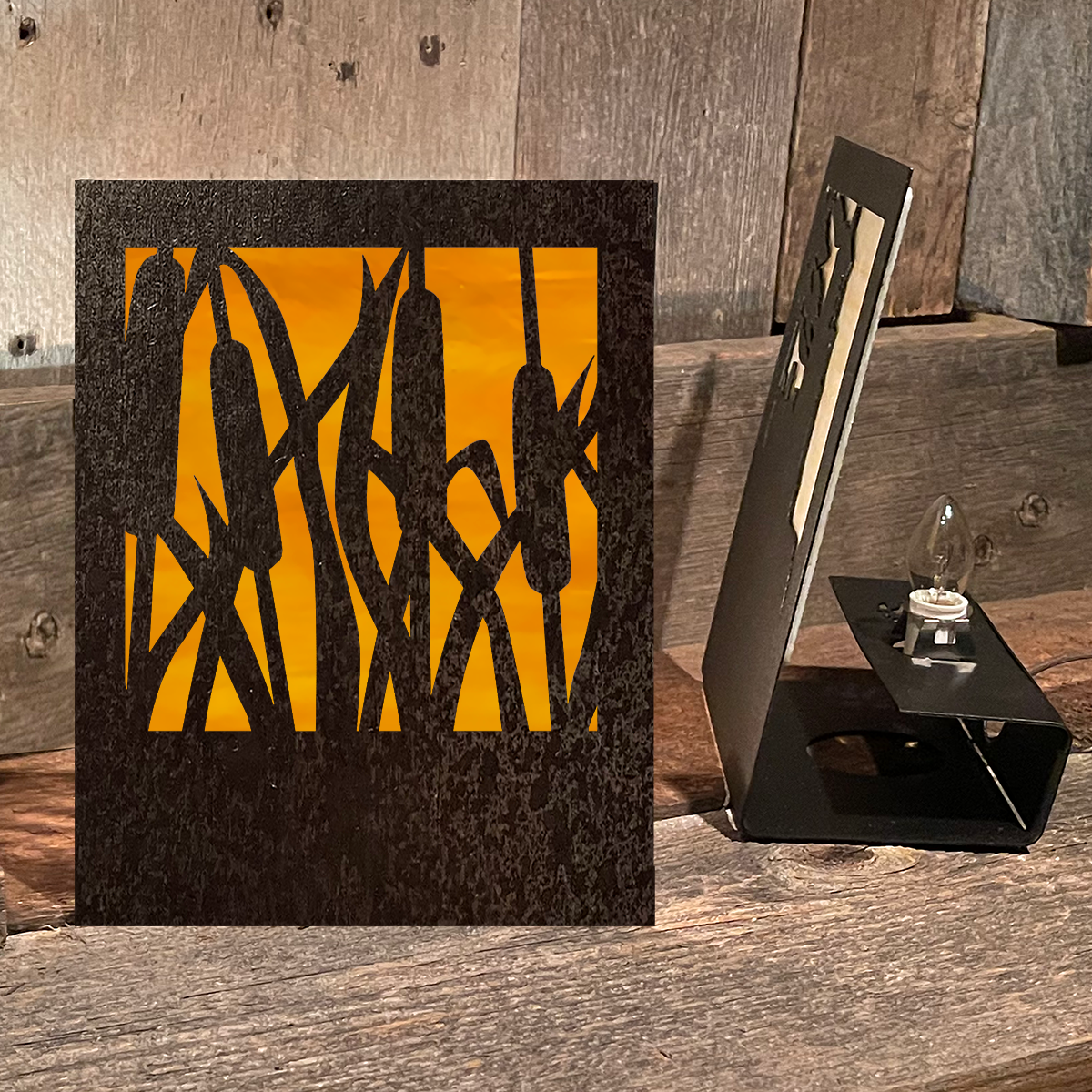 This Iron Pine easel-style accent lamp features the silhouette of cattails. Lamp measures 6.5" wide x 8.5" high x 4" deep. It is crafted from 18-gauge steel. Choose your finish and stained glass with the "customize" button.