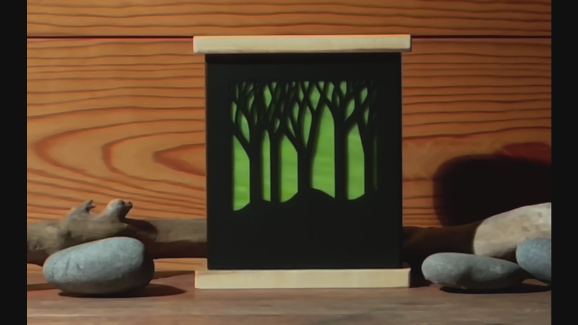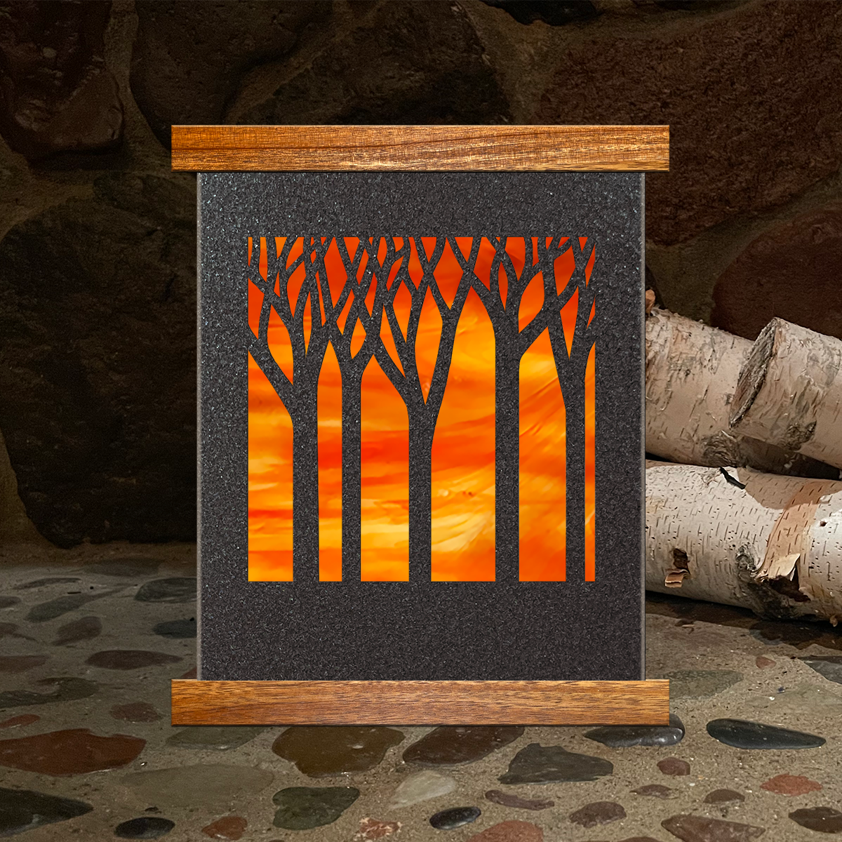 Small Iron Pine accent lamp featuring a silhouette of a forest. Lamp measures 5" wide x 6" high x 3.5" deep. It is crafted from 20-gauge steel. The base and top are made from acacia wood and have a matte finish. You choose any of six colors for your stained glass!