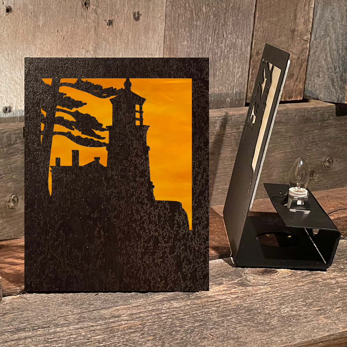 This Iron Pine easel-style accent lamp features the silhouette of the Iconic Split Rock Lighthouse, perched on a cliff on Lake Superior's north shore. Lamp measures 6.5" wide x 8.5" high x 4" deep. It is crafted from 18-gauge steel. Choose your finish and stained glass with the "customize" button.