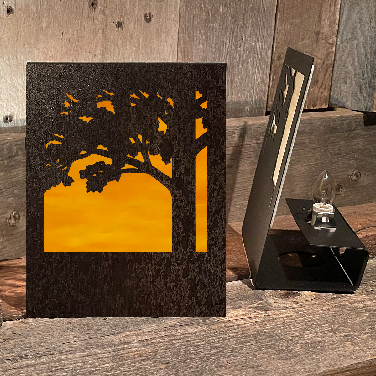 This Iron Pine easel-style accent lamp features the silhouette of a shade tree which may be interpreted as either oak or maple. Choose your finish and stained glass with the "customize" button.